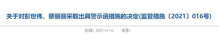 智通财经APP获悉,11月11日,黑龙江证监局对彭世伟、蔡丽丽出具警示函。黑龙江证监局指出,二人在江海证券有限公司双鸭山新兴大街证券营业部任职期间,向投资者传递非由证券公司统一提供的证券类金融产品宣传推介材料及有关信息。上述行为违反了《证券经纪人管理暂行规定》。