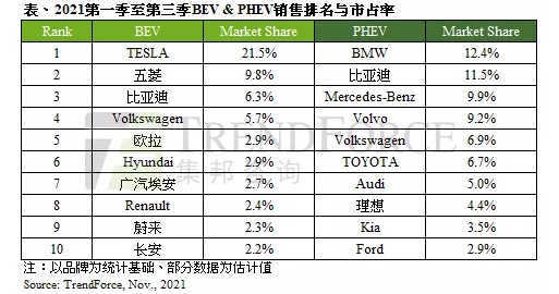 纯电动车部分,特斯拉(TSLA.US)以21.5%的市占率稳居第一,前三季的总销量已经超越其在2020的全年成绩。第二名为五菱宏光,持续维持高销量的主因除了低价之外,另一个原因为销售区域从过去的中国三、四线城市逐步扩展到一、二线城市,显示其消费族群正在扩大与转变。比亚迪与Volkswagen分别为第三名和第四名,其中Volkswagen在2021年十分积极地将其纯电动车系列收敛至ID. Family,第三季开始几乎皆以ID.系列车款为主要纯电动车款销售。纯电动车市场虽成长快速,但在传统车厂加速推出车款、新兴车厂开始交车后皆让竞争加剧。
