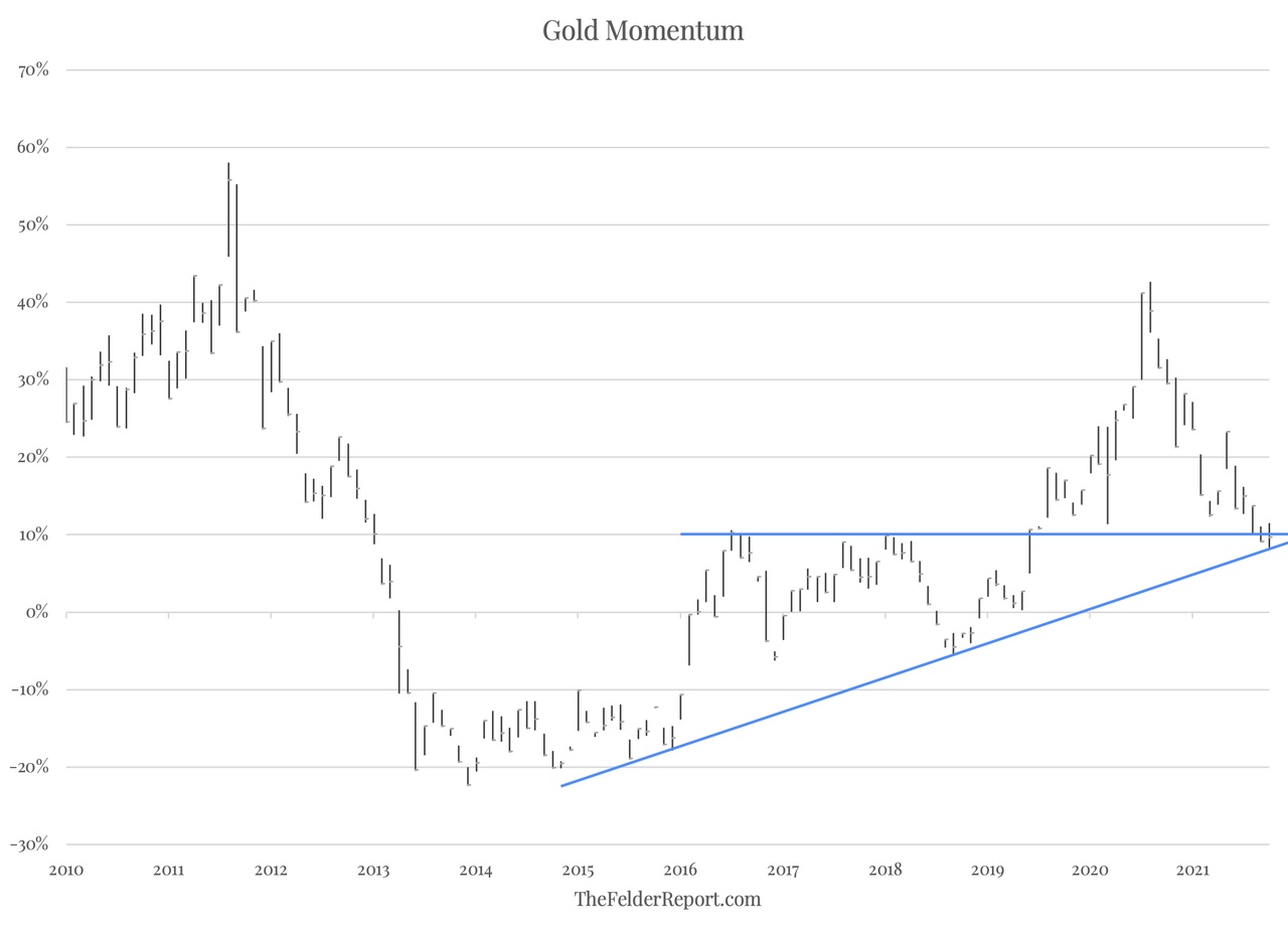 简而言之,黄金长期动量图显示了黄金价格典型的看涨态势,这也让黄金投资者得以确定自己的风险。而在价格图表上,风险几乎难以分析。