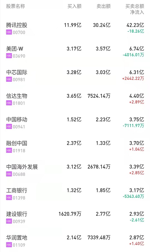 北水净买入最多的个股是中国海外发展(00688)、信达生物(01801)、融创中国(01918)。北水净卖出最多的个股是腾讯(00700)、建设银行(00939)、龙源电力(00916)。