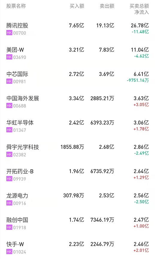 快手-W(01024)获净买入2亿港元。消息面上,快手将于本月23日发布三季度业绩。机构指出,快手第三季用户增长基本符合预期,预期下半年业绩环比会有改善。兴业证券预测公司Q3营收同比增长31.6%至202亿元,毛利率约为43%,销售费用率59%,经调整净利率35%。西南证券则预计公司3Q实现营业收入199.37亿元,YoY+30%,归母净利润-78.95亿元,DAU同比提升15%至3.14亿人。