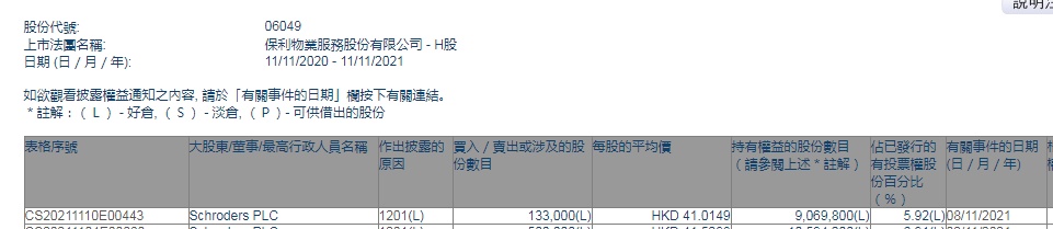 智通财经APP获悉,香港联交所最新资料显示,11月8日,Schroders PLC减持保利物业(06049)13.3万股,每股作价41.0149港元,总金额约为545.50万港元。减持后最新持股数目为906.98万股,最新持股比例为5.92%。