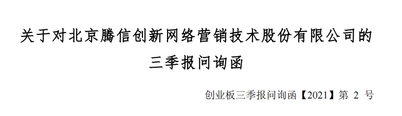 智通财经APP获悉,11月11日,深交所向北京腾信创新网络营销技术股份有限公司(腾信股份,300392.SZ)发出三季报问询函。深交所在对该公司2021年第三季度报告审查过程中发现,公司2021年前三季度实现营业收入28,653.33万元,较上年同期下滑