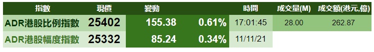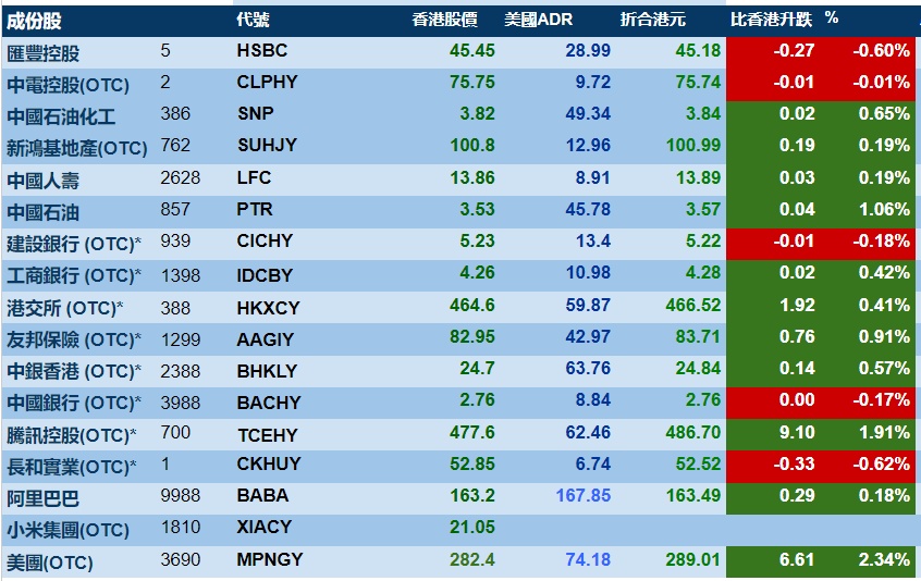 智通财经APP获悉,周四美股三大指数涨跌不一,港股ADR指数上涨,按比例计算,收报25402点,涨155.38点或0.61%。