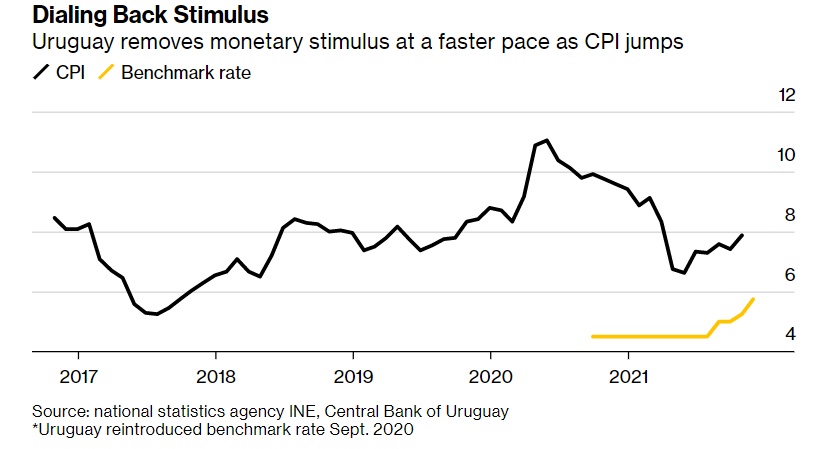 乌拉圭央行于当地时间周四宣布将基准利率从5.25%上调至5.75%,以帮助通胀预期达到3%-6%的目标区间。在此之前,该国央行10月份宣布上调基准利率25个基点,8月宣布上调50个基点。