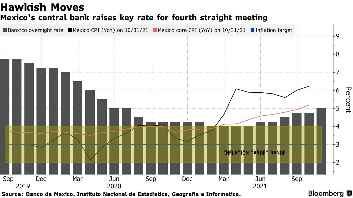 拉美各国央行纷纷加快加息步伐,主要因为能源和食品价格持续攀升,使得该地区国家的高通胀形势日益严峻。同样是在周四,墨西哥央行宣布将基准利率继续上调25个基点至5%。
