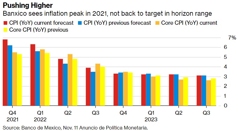 根据墨西哥央行的预测,通胀将在2021年达到峰值。在声明中墨西哥央行还表示,预计通胀率将在今年年底达到6.8%,2022年年底达到3.3%,在2023年第三季度将达到3.1%,接近通胀目标。