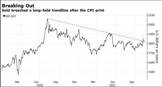 当然,近期美国实际利率持续下跌的本质原因,依然是对高通胀的深层次恐慌,尤其是在隔夜爆表的最新10月CPI数据出炉后,被一下子彻底激发,而昔日传统的通胀对冲工具黄金,则因此搭上了顺风车。