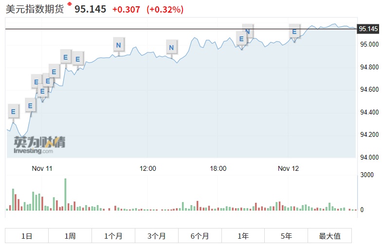 美国10月CPI同比上涨6.2%,创1990年来最大升幅,通胀猛烈的上涨势头,将迫使美联储加速完成Taper,并提前加息。因此明年美国加息的概率将进一步提高,对美元走强有所提振。数据显示,美元指数在周三美国通胀数据公布后,连续两个交易日上涨,触及95.197高点,为为2020年7月22日以来的最高水平。截止发稿,美元指数上涨0.32%至95.145。