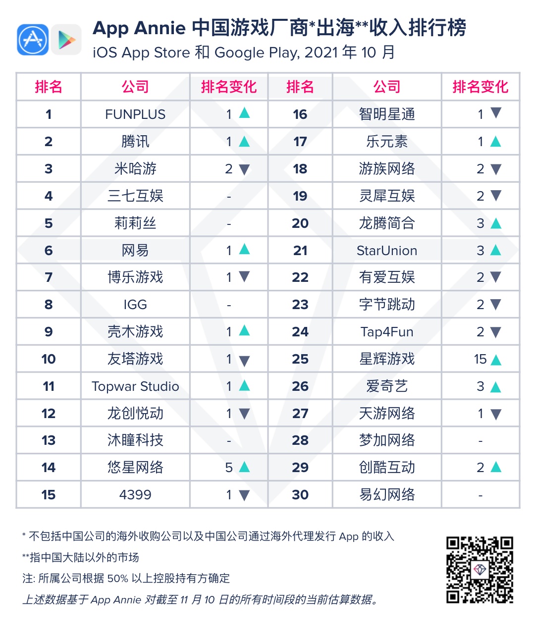 在 Top 30 中国出海游戏榜单中,有 4 款游戏来自 FunPlus, 让 FunPlus 在 10 月成为中国出海游戏厂商 10 月冠军,为第四季度迎来了一个良好开端!