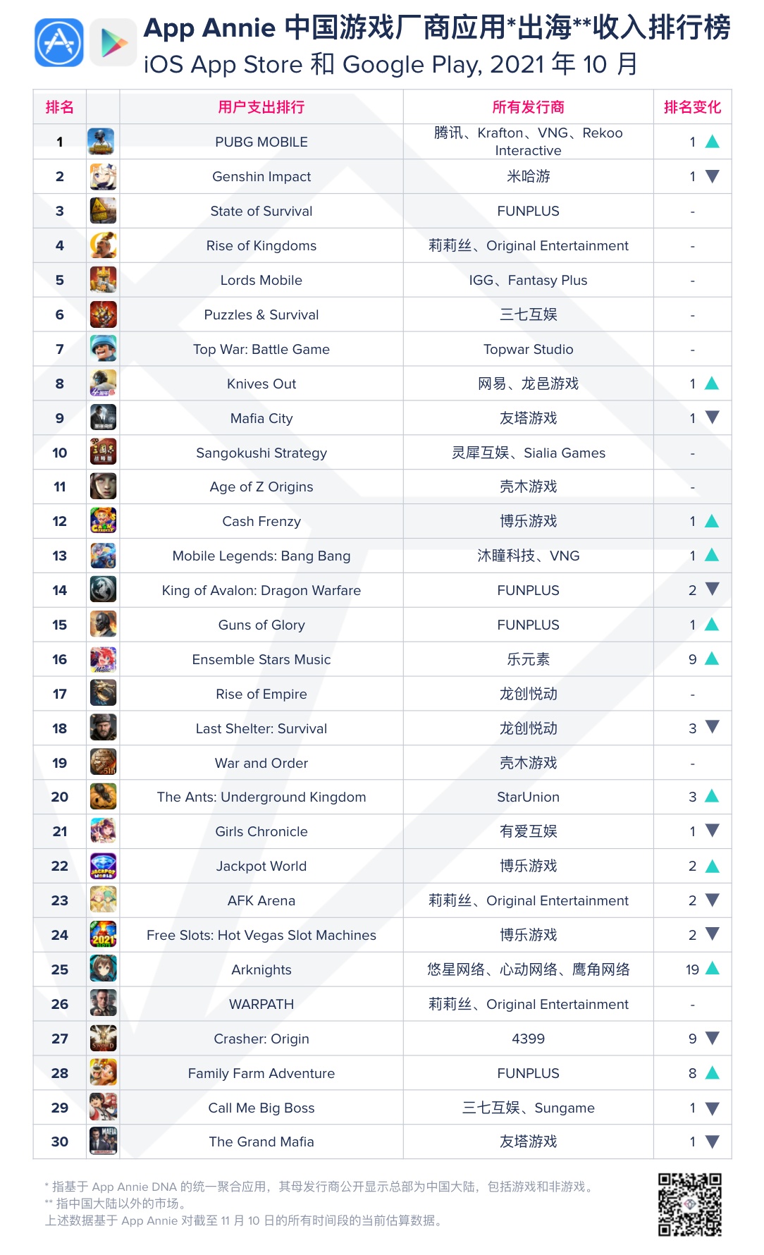 10 月出海游戏 Top 30 榜单头 10 位变化甚微,PUBG 与原神在冠亚军位置互相追赶,最终 PUBG 胜出带来了 10 月 Top10 的排名变化。