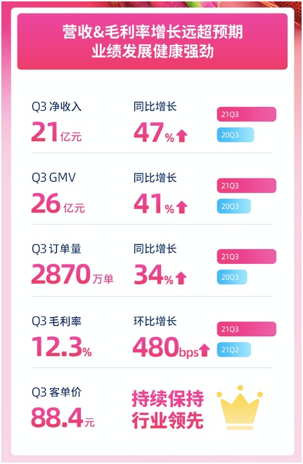 智通财经APP获悉,2021年11月12日,社区零售领军企业每日优鲜(MF.US)公布了截至2021年9月30日的第三季度业绩报告。财报显示,每日优鲜净收入同比增长47.2%至21.2亿元,超过45%的增速指引上限。同时,其毛利率环比增长4.8个百分点至12.3%,超过3.5个百分点的环比提升指引上限。此外,每日优鲜的美国会计准则下净亏损在第三季度环比降低了39%, 非美国会计准则下净亏损率环比缩窄5.2个百分点。这意味着在保持高速增长的同时,每日优鲜也在稳步提升经营效率,兼顾了增量和质量。