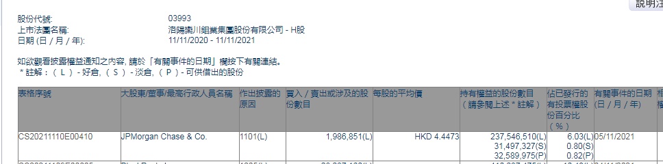 智通财经APP获悉,香港联交所最新资料显示,11月5日,小摩增持洛阳钼业(03993)198.6851万股,每股作价4.4473港元,总金额约为883.61万港元。增持后最新持股数目约为2.38亿股,最新持股比例为6.03%。
