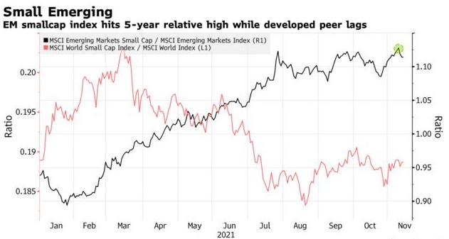 在新兴市场,投资大盘股已经太过时了。本周一项衡量新兴市场小盘股的指数反弹至5年相对高点,而发达市场小盘股的表现截然相反。