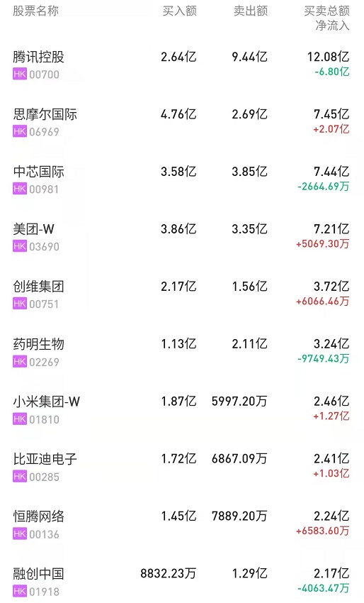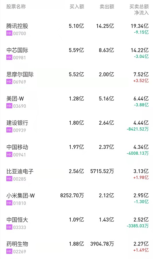 此外,恒腾网络(00136)获净买入6583万港元。而建设银行(00939)、中国移动(00941)分别遭净卖出8421万、4008万港元。