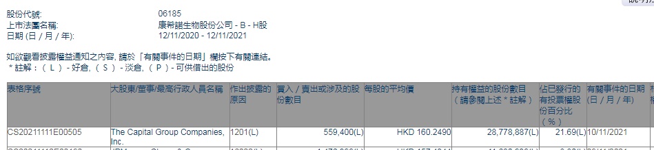 智通财经APP获悉,香港联交所最新资料显示,11月10日,美国资本集团减持康希诺生物-B(06185)55.94万股,每股作价160.2490港元,总金额约为8964.33万港元。减持后最新持股数目约为2877.89万股,最新持股比例为21.69%。