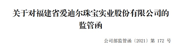 智通财经APP获悉,11月12日,深交所向爱迪尔(002740.SZ)发出监管函。监管函指出,爱迪尔2021年7月31日披露的公告显示,原控股子公司大盘珠宝于2020年4月起不再纳入爱迪尔合并报表范围。而爱迪尔2021年6月30日披露的公告显示,爱迪尔收到深圳市特发小额贷款有限公司提交的两份《裁决书》,大盘珠宝于2018年8月为苏建明、朗娇翀以及苏华清分别向特发小贷借款900万元提供连带责任担保,担保金额合计为1,800万元,占爱迪尔2017年末经审计净资产的1.22%。大盘珠宝的上述担保事项,爱迪尔未履行相应的审议程序和信息披露义务。上述行为违反深交所相关规定。
