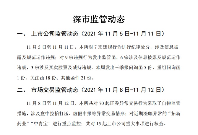 智通财经APP获悉,11月12日,深交所发布深市监管动态。其中指出,11月8日至11月12日,深交所共对70起证券异常交易行为采取了自律监管措施,涉及盘中拉抬打压、虚假申报等异常交易情形;对近期涨幅异常的“拓新药业(301089.SZ)”“中青宝(300052.SZ)”进行重点监控;共对15起上市公司重大事项进行核查。