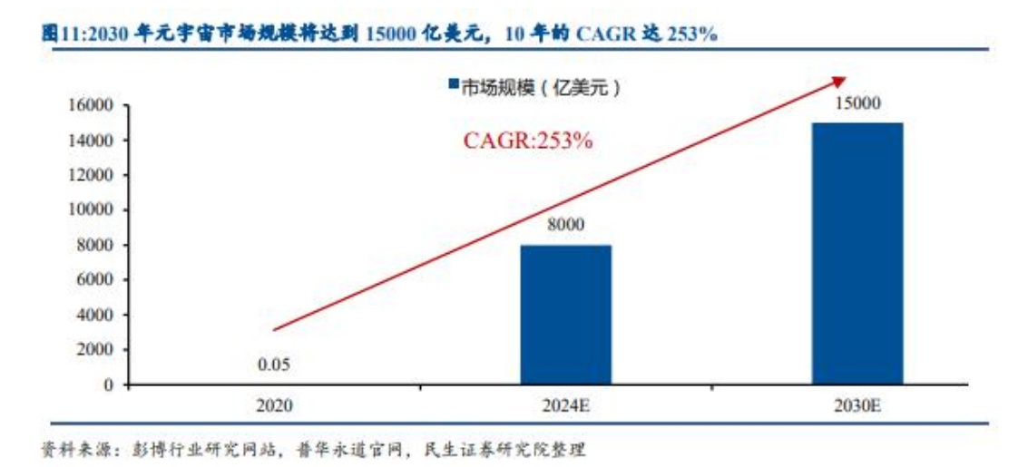 彭博行业研究预计,元宇宙市场规模或将在2024年达到8000亿美元;普华永道预计,元宇宙相关经济将迎来大幅增长,市场规模有望从2020年的500万美元增至2030年的15000亿美元,2020-2030年的CAGR达253%。