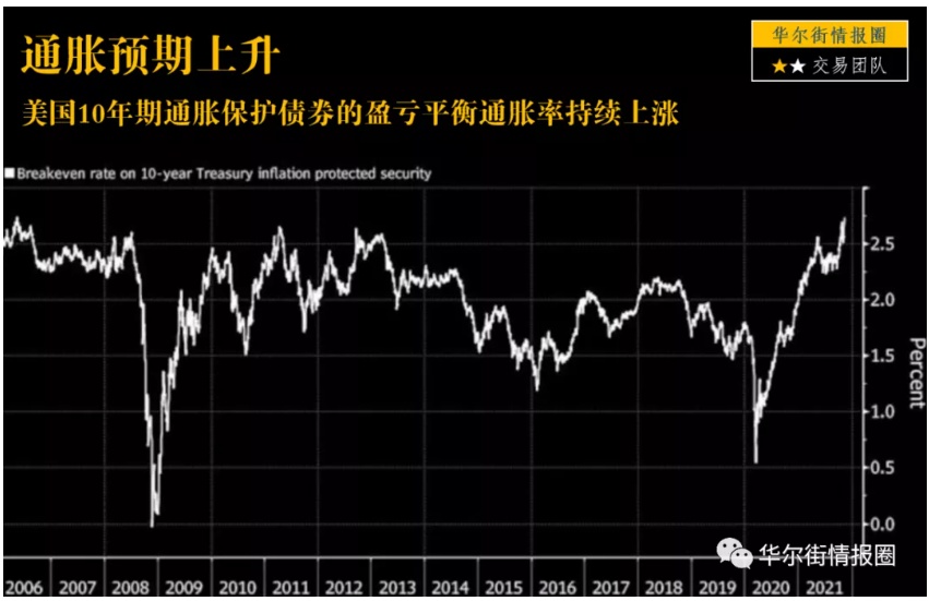 肉眼可见的是,债券市场对美国未来十年的通胀预期升至2006年以来最高水平——10年期通胀保护债券的盈亏平衡通胀率上涨逾5个基点至2.76%,这反映出人们确信所看到的通胀,并非像最初预想的那样只是暂时性的。