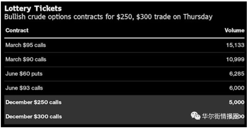 当前的油价在80美元水平,但已经有交易员在期权市场押注将涨至250美元。周四稍晚约有相当于500万桶布伦特250美元/300美元的看涨期权价差交易。这是今年以来交易员首次押注原油价格超过200美元,合约的总成本约为80万美元。