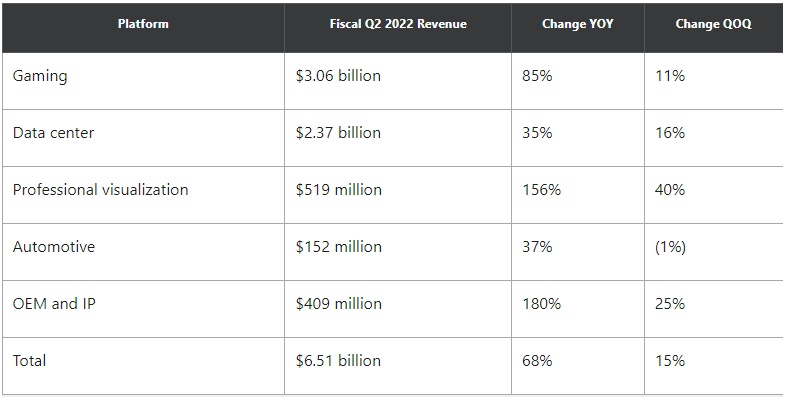 投资者应该关注两大业务的表现:游戏和数据中心。英伟达的整体业绩是由这两项业务推动的,在2022财年的Q1和Q2,这两项业务合计占该公司总营收的85%和83%。