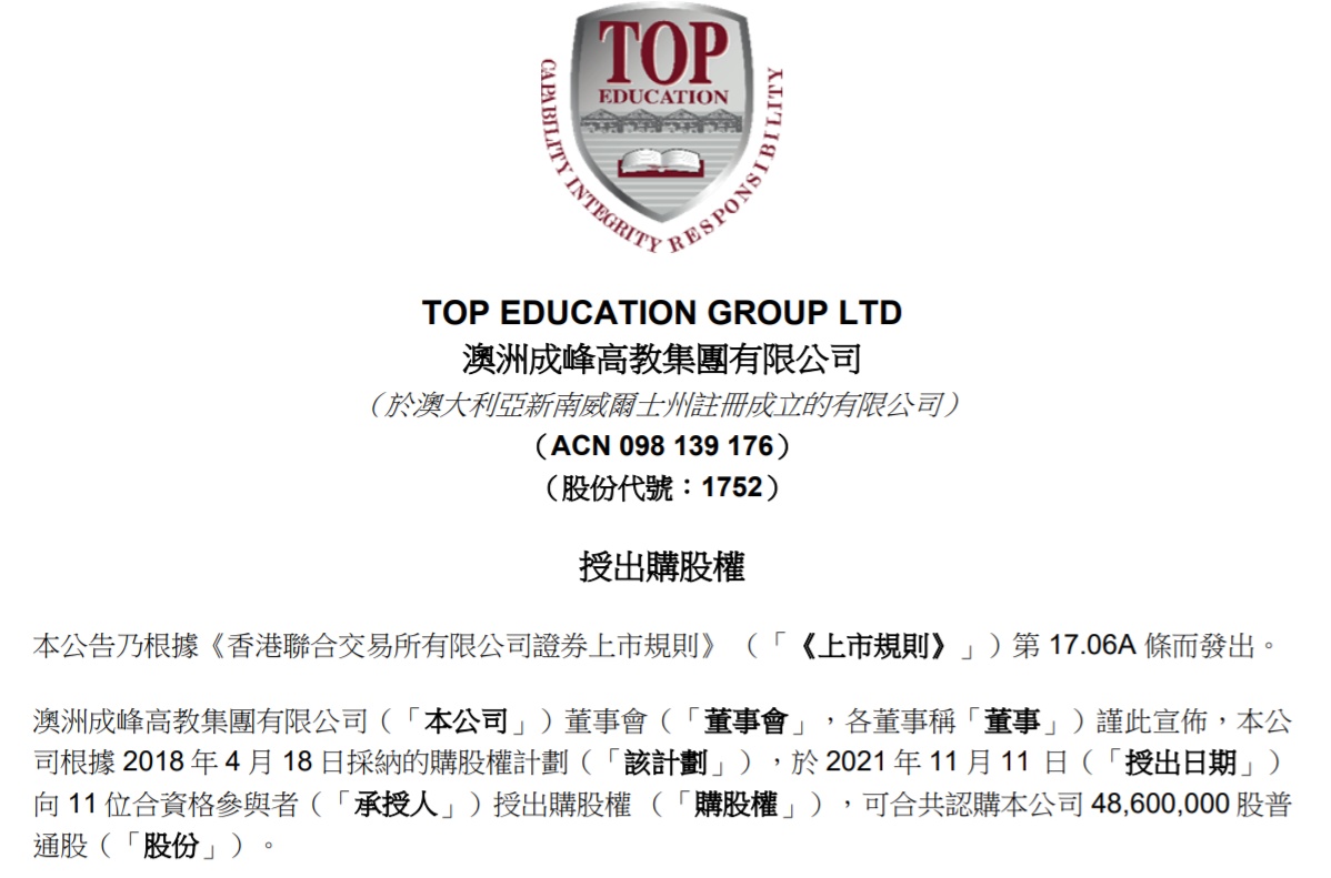 11月11日,澳洲成峰高教(01752)发布了《授出购股权》的公告。据该公告显示,澳洲成峰高教于2021年11月11日向11位符合资格的参与者授出购股权,可合共认购公司4860万股的普通股。