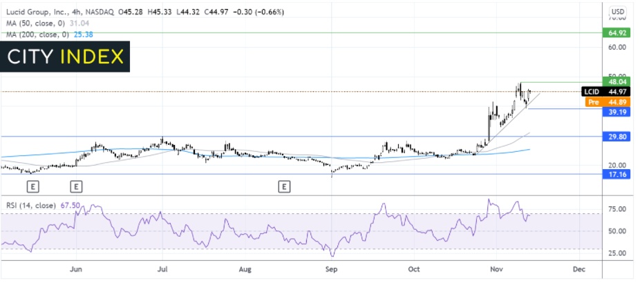 Lucid股价的交易情况自5月底以来一直处于持有状态,股价上限为30美元,下限为17.20美元。股价在10月下旬突破了这一区间,并一直呈急剧上升趋势,不过在48美元处遇到阻力。随着整固令相对强弱指数走出超买区域,该指数已略有回落。