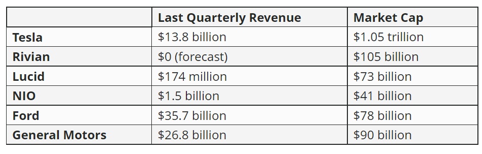 由于投资者考虑到电动汽车的先发优势和以科技为主导的业务,电动汽车股票具有巨额溢价,但传统汽车制造商则落后于此,尽管老牌车企目前在美国生产和销售的汽车数量大大增加。事实证明,尽管电动汽车公司的销售额远低于福特(F.US)或通用汽车(GM.US)等传统公司,但它们的估值却远高于这些传统汽车制造商。