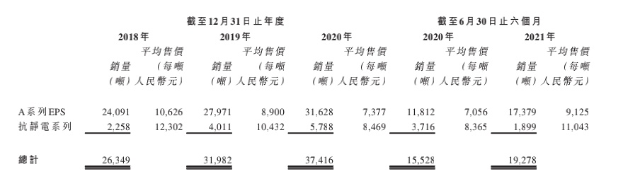 从销量来看,无论是A系列EPS或是抗静电系列,报告期内两大产品均实现了稳步增长。其中A系列EPS的销量从2018年的2.40万吨增长至2020年的3.16万吨,年复合增速约68%,2021年上半年销量则同比增长47%至1.74万吨。抗静电系列的销量从2018年的2258吨增长至2020年的5788吨,年复合增长率为116%。可见,在稳步发展A系列EPS产品之时,裕河控股的抗静电系列产品增长势头强劲。