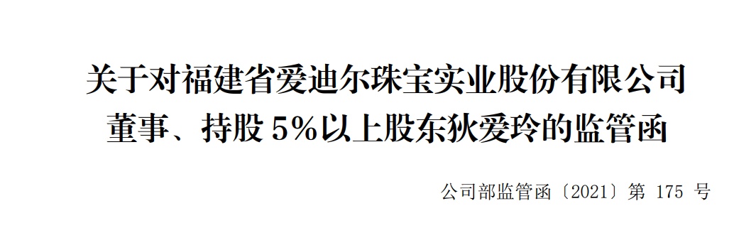 智通财经APP获悉,11月15日,深交所向福建省爱迪尔珠宝实业股份有限公司(爱迪尔,002740.SZ)董事、持股