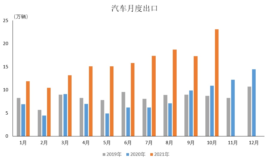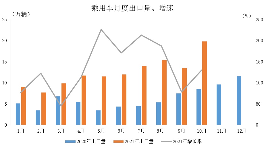 2021年10月,乘用车本月出口19.8万辆,环比增长47.3%,同比增长1.3倍。2021年1-10月,乘用车出口125.8万辆,同比增长1.3倍。