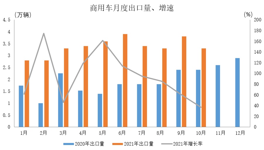 2021年10月,商用车出口3.3万辆,环比下降13.8%,同比增长37.2%。2021年1-10月,商用车出口33.6万辆,同比增长86.0%。