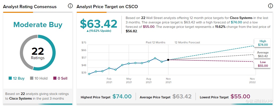 TipRanks网站显示,过去三个月,华尔街有12位分析师予思科“买入”评级,有10位予“持有”评级,共识评级为“适度买入”,平均目标价为63.42美元,较当前水平有11.6%的上涨空间。