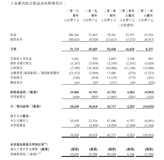 公司于2018年至2020年度及2021年前六个月,收益分别约为人民币1亿元、人民币5560.5万元、人民币7056.1万元及人民币1525.4万元。于2018年至2020年度,公司录得纯利约为人民币1863万元、人民币1881.8万元及人民币4271.7万元,而于2021年前六个月则录得亏损净额约人民币1003.5万元。
