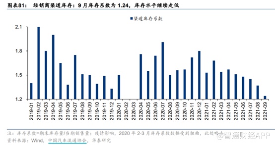 不仅如此,目前汽车经销商库存处于底部。由于汽车缺芯的影响,导致汽车行业被迫去库存。根据中国汽车流通协会公布显示,汽车经销商库存系数9月份下降到了 1.24,同比下降 20.5%,环比下降 9.5%,库存系数仍在警戒线下方;同期经销商预警指数为 50.9%,同比下降 5.7%,环比下降 1.5%,位于荣枯线之上。