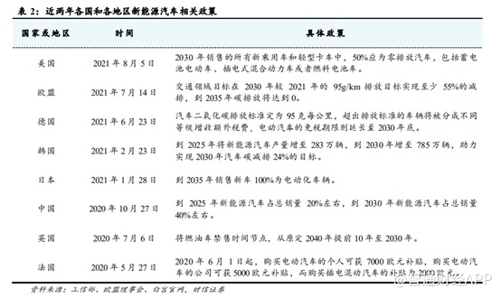 为响应碳减排的目标,各国都是大力支持新能源汽车的发展。从近两年各国和各地区新能源汽车相关政策来看,大多数国家或地区的目标是在2030年实现50%新车销售为新能源汽车,在2035年实现100%新车销售为新能源汽车。