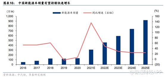 按照我国新能源车发展规划中推算,至2025年新能源车销量渗透率达到20%以上,新能源汽车销量有望在2021-2025年维持快速增长。