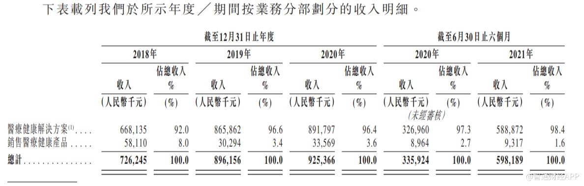 截至2018年、2019年及2020年12月31日止年度以及截至2021年6月30日止六个月,公司提供医疗健康解决方案所产生的收入分别为6.681亿元、8.659亿元、8.918亿元及5.889亿元,分别占同期总收入的92%、96.6%、96.4%及98.4%。