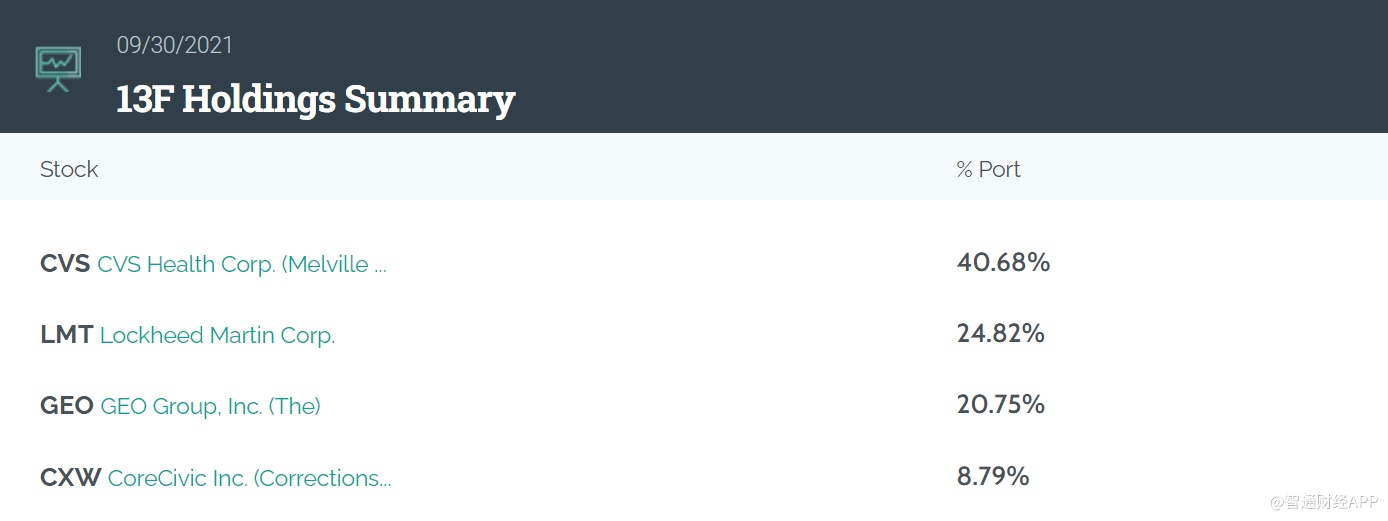 截至三季度,他的前四大持仓按顺序排列为CVS健康(CVS.US)、洛克希德马丁(LMT.US)、GEO Group Inc(GEO.US)以及CoreCivic Inc(CXW.US)。