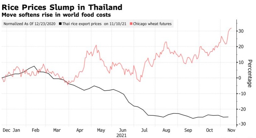 加拿大和美国部分地区的严重干旱,加上黑海地区的干旱,导致全球需求扩大,小麦供应减少。与此同时,世界上最大的大米运出口国之一泰国的降雨量增加提高了大米产量。泰国大米出口商协会名誉主席Chookiat Ophaswongse表示,由于降雨结束了长期干旱,今年泰国大米产量预计将增长20%以上。