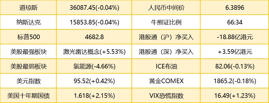 1. 隔夜美股截至收盘,道指跌12.86点,或0.04%,报36087.45点;纳指跌7.11点,或0.04%,报15853.85点;标普500指数跌0.05点,报4682.80点。港股ADR指数下跌,按比例计算,收报25359点,跌30.85点或0.12%。特斯拉劲敌Rivian股价再创历史新高,收盘大涨14.94%。