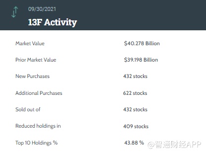 第三季度,野村控股持仓总市值为402.78亿美元,上一季度为391.98亿美元,环比增长3%。持仓新增标的432只,增持622只标的,减持409只标的,清仓432只标的。截止至2021年9月30日,该基金前十大持仓标的占总市值的43.88%。