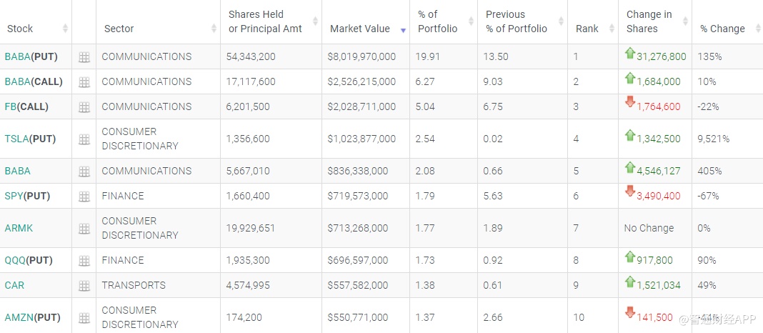 特斯拉看跌期权(TSLA.US,PUT)、阿里巴巴(BABA.US)分别位列第四、第五,持仓市值分别为10.24亿美元、8.36亿美元。