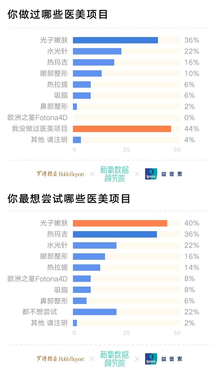 具体到医美消费需求,受访者更青睐轻医美,光子嫩肤、热玛吉最受青睐,在高净值人群消费意愿排行中居第一、二位,分别占比高达40%、36%。
