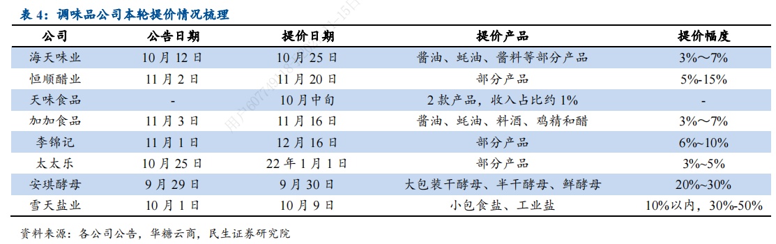 具体来看,自10月25日起,海天味业旗下的主要产品酱油、耗油、酱料等价格将上浮3%-7%;自11月20日起,恒顺醋业的部分产品价格将上浮5-15%;自12月16日起,李锦记的部分产品价格则上浮6%-10%。