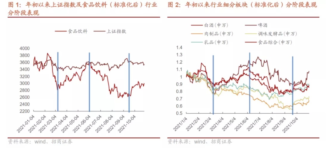 一是:冲高回落期。年初至三月初,在国内流动性收紧,美债收益率上行的背景下,板块较大幅度回调。高估值品种如次高端白酒、啤酒等由于大豆、PET等原材料延续了上行趋势,而企业由于需求等原因尚未提价的调味品板块,股价回调较大。