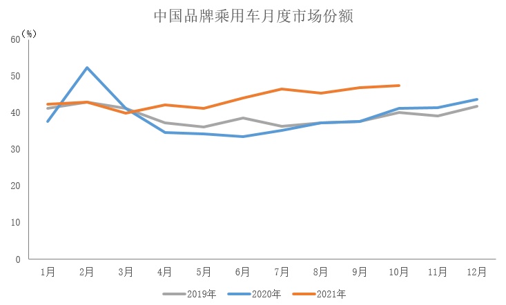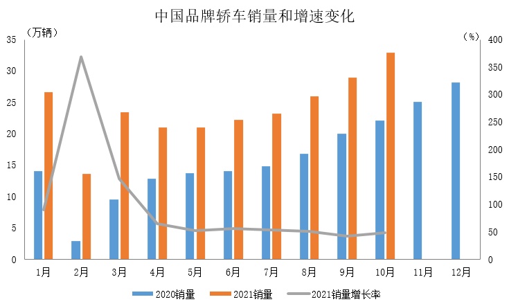 2021年1-10月,中国品牌乘用车共销售738.7万辆,同比增长28.1%,占乘用车销售总量的43.8%,占有率比上年同期提升6.6个百分点。
