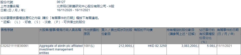 智通财经APP获悉,香港联交所最新资料显示,11月11日,Aggregate of abrdn plc增持昭衍新药(06127)21.2万股,每股作价82.325港元,总金额为1745.29万港元。增持后最新持股数目为308.32股,最新持股比例为5.08%。