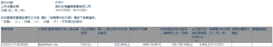 智通财经APP获悉,香港联交所最新资料显示,11月10日,贝莱德减持锦欣生殖(01951)53.2万股,每股作价10.6811港元,总金额约为568.23万港元。减持后最新持股数目约为1.25亿股,最新持股比例为4.99%。